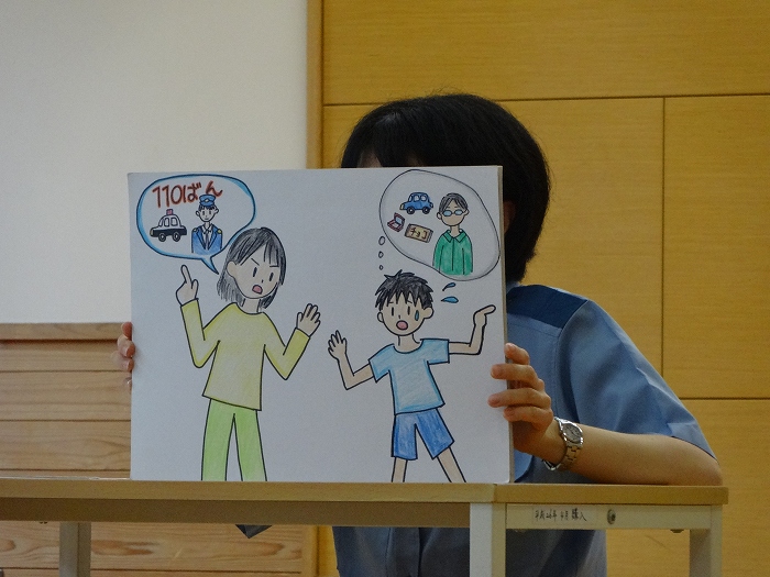写真は、訓練の後に署員さん手作りの紙芝居の読み聞かせをしていただいているところです。分かりやすい絵とお話に引き込まれ、よく見て、聴いていた子どもたちです。