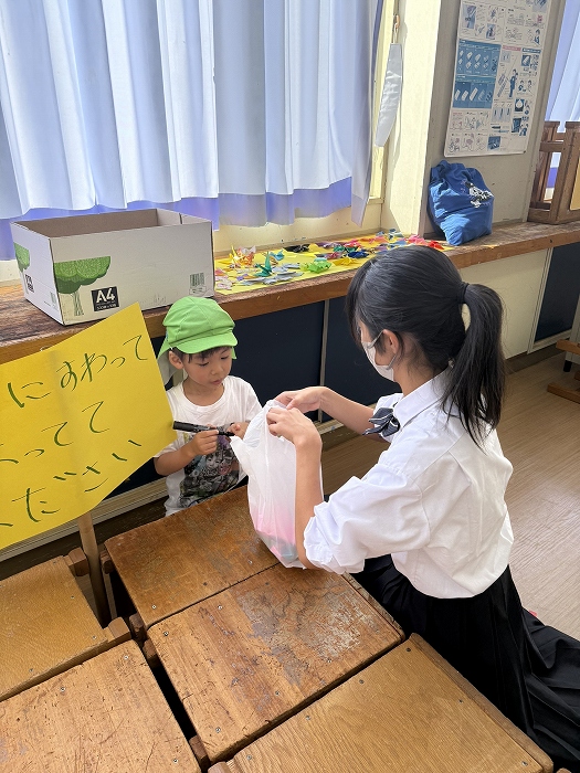 中学生の作る景品はレベルが高い!初めて見る折り紙の景品に、子どもたちは驚き、ゲットするととても大事そうに抱えていました。