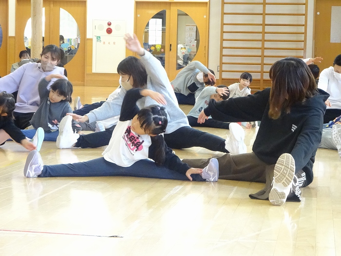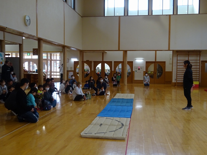 お馴染みとなっております「カワイ体育教室」の講師の先生から、様々な運動遊び、親子で触れ合いながら楽しめる遊びを沢山教えていただきました。今回は2歳以上が対象です。前半は2,3歳児親子、後半は4,5歳児親子が楽しみました。