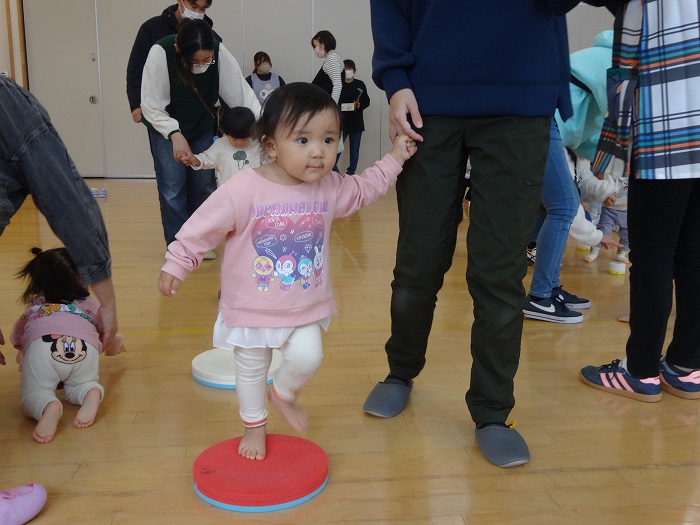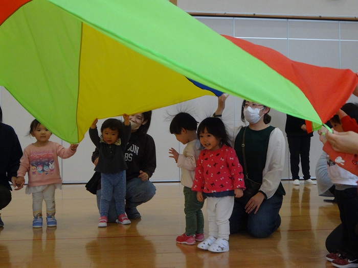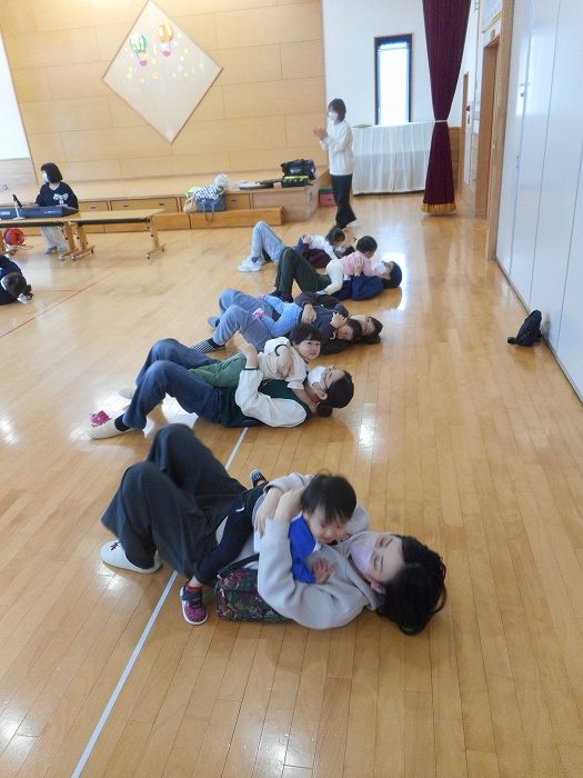 今回は、0,1歳児親子向けに保護者会研修部主催の保護者学習会「親子リズム遊び」が開催されました。