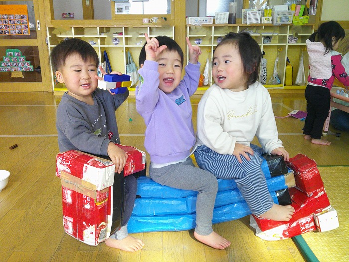牛乳パックの台を組み合わせて”消防車”作ったよ!