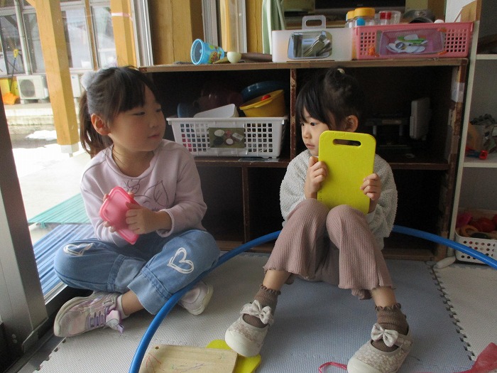 「タブレットで、もしもし~してるんだよー!」と蓋とまな板をタブレットに見立てて…